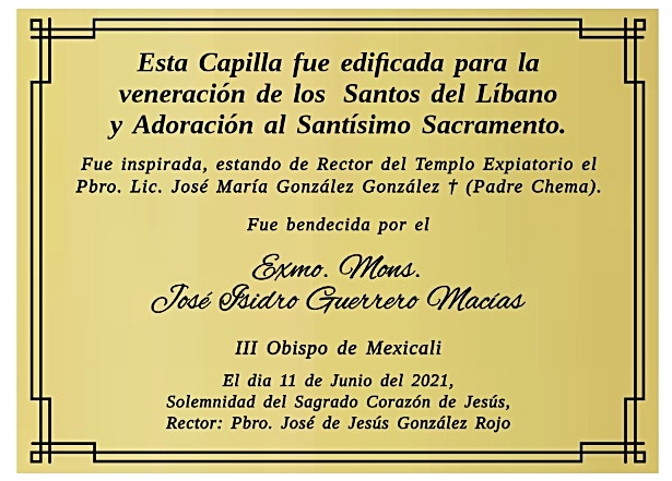 جرى يوم الجمعة الماضي افتتاح كنيسة صغيرة (كابيلا) لتكريم قديسي لبنان، مار شربل ورفقا والحرديني والطوباوي أسطفان نعمة، في مدينة مكسيكالي الواقعة في ولاية Baja California في شمال المكسيك.