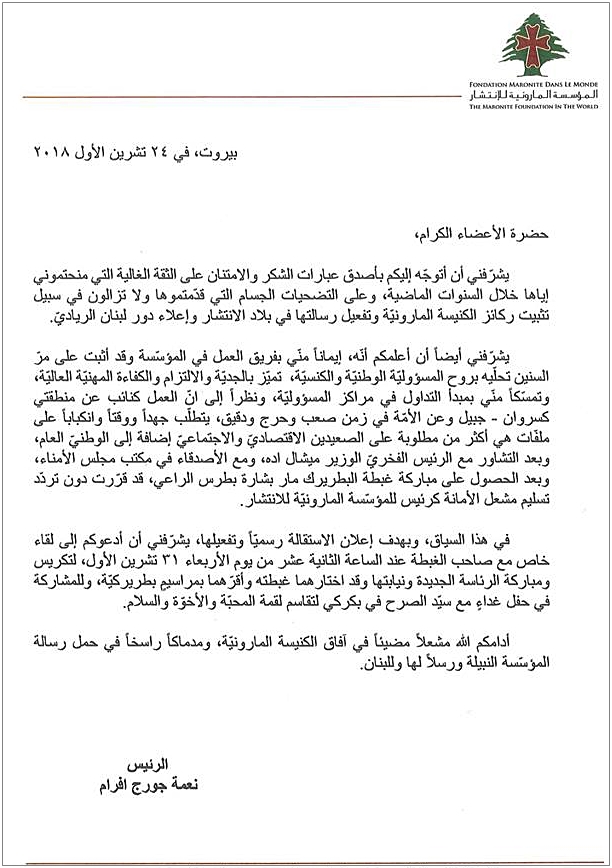 وكان النائب نعمة افرام قد أعلن قبل أيام أنه استقال من منصبه كرئيس للمؤسسة المارونية للانتشار نظراً إلى أن العمل كنائب عن منطقتي كسروان – جبيل وعن الأمة في زمن صعب ودقيق يتطلب الكثير من الوقت والحهد. وقال في بيان وجهه إلى أعضاء المجلس إنه "بعد التشاور مع الرئيس الفخري ميشال إده ومع مكتب مجلس الأمناء، وبعد الحصول على مباركة البطريرك مار بشارة بطرس الراعي، قد قررت دون تردد تسليم مشعل الأمانة كرئيس للمؤسسة المارونية للانتشار". وأضاف: "بهدف إعلان الاستقالة رسمياً وتفعليها يشرفني أن أدعوكم إلى لقاء خاص مع البطريرك عند الساعة الثانية عشرة من يوم الأربعاء 31 تشرين الأول، لتكريس ومباركة الرئاسة الجديدة ونيابتها، وقد اختارهما الراعي وأقرهما بمراسيم بطريركية".