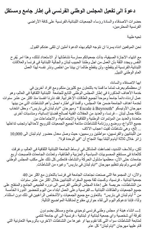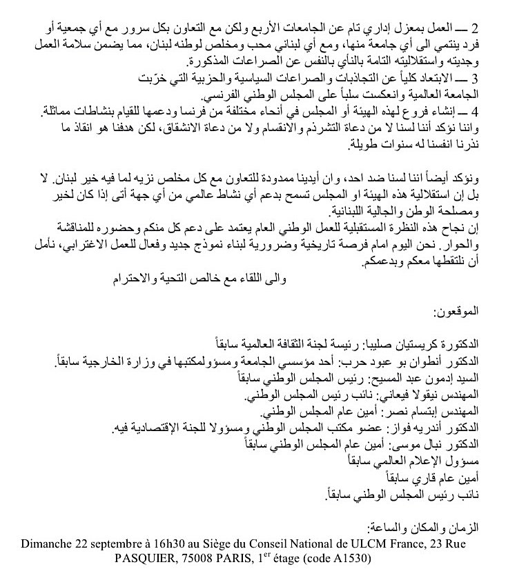 وجه عدد من المسؤولين السابقين والحاليين في الجامعة اللبنانية الثقافية في فرنسا دعوة إلى رؤساء الجمعيات اللبنانية-الفرنسية لاجتماع يعقد هذا الأحد في باريس بهدف البحث في "إعادة تفعيل المجلس الوطني الفرنسي في الجامعة والعمل لتحضير لإقامة الدورة الخامسة من مهرجان "أيام لبنان في باريس" بعد أشهر من الآن. وقال الموقعون على نص الدعوة إن مبادرتهم تأتي بعدما "ازدادت المشاكل في أوساط الجامعة اللبنانية الثقافية في العالم (...) وتعدّدت الجامعات فأصبحت أربع جامعات حتى الآن، ومعظمها مشلول الحركة والنشاط، فانعكس كل ذلك على مكتب المجلس الوطني الفرنسي ولم يتم تنظيم مهرجان "أيام لبنان في باريس" وغيره من النشاطات".