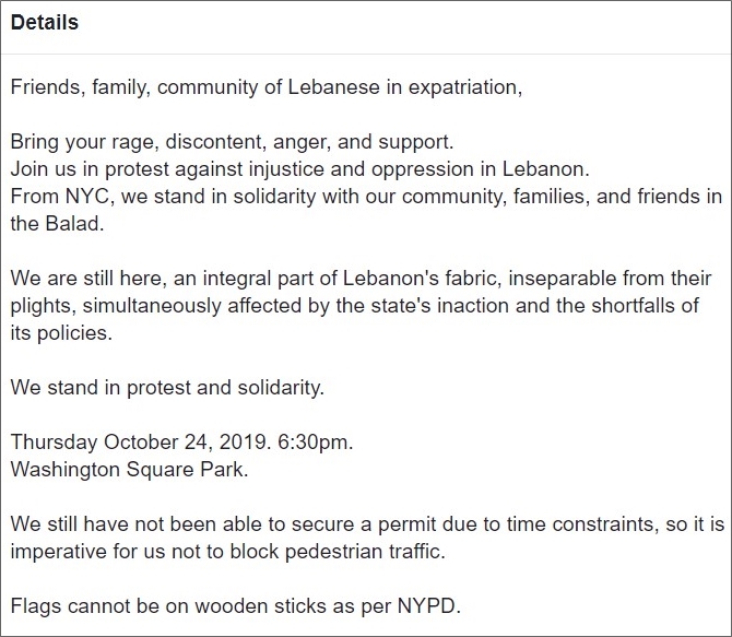 سيتم التجمع في واشنطن سكوير الذي شهد تحركا سابقاً لأبناء الجالية في نيويورك يوم الأحد الماضي أطلق فيه المعتصمون نداءات تدعو الحكومة إلى الاستقالة وتقول للسلطة بالصوت العالي: "فلوا بدنا نرجع"!