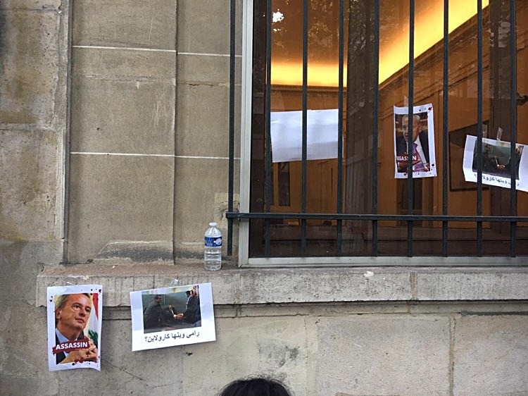 ووزع مشاركون في هذا التحرك صوراً وفيديوهات عن مدخل السفارة وجدرانها الخارجية وقد امتلأت بصور زعماء لبنانيين وكتب عليها “مجرمون”.