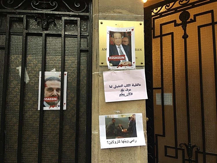 انتشر عبر تطبيق "واتساب" ومواقع التواصل الاجتماعي فيديو يظهر فتاتين تقتحمان مقراً رسمياً لبنانياً قيل إنه مقر السفارة اللبنانية في باريس، حيث دخلتا من الباب الرئيسي وقامتا على عجل بنزع صورة رئيس الجمهورية ميشال عون عن الحائط وكسرها على الأرض، قبل أن يسارع موظفو السفارة بطردهما.