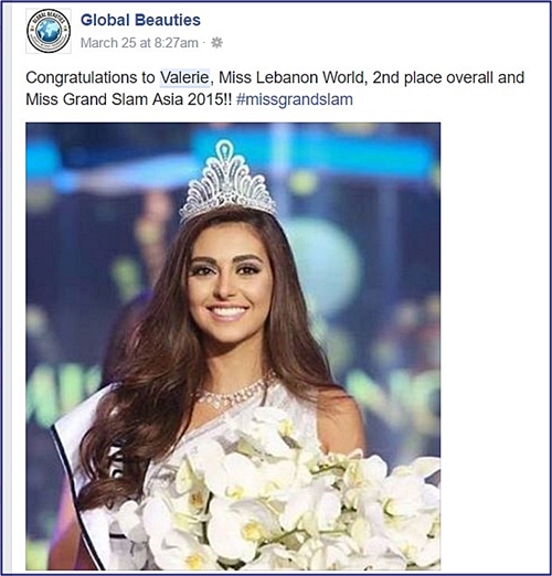 نالت ملكة جمال لبنان لعام 2015 فاليري أبو شقرا عددأ من الألقاب الجمالية العالمية الجديدة الأسبوع الماضي بنتيجة مسابقة أجرتها مجلةGlobal Beauties العالميّة المتخصّصة بالجمال وأعلنت عن نتائجها تباعاً يوميْ الخميس والجمعة الماضيين. ففازت فاليري بلقب "صاحبة أجمل وجه في العالم"، كما حازت على المركز الجمالي الثاني في العالم وعلى لقب "الأجمل في قارة آسيا."