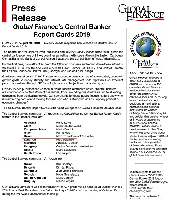 حاز حاكم مصرف لبنان رياض سلامة على درجة A في تقرير مجلة Global Finance للعام 2018 الذي شمل 85 حاكم مصرف مركزي في العالم علماً أن "غلوبال فاينانس" هي من أهم المجلات الاقتصادية في العالم. وقد حل سلامة من بين عشرة حكام حصلوا على الدرجة الأولى في التصنيف. وهذه المرة الثالثة التي يفوز فيها سلامة بهذا التصنيف الرفيع بعد أن كان قد حاز عليه في عامي 2011 و2017.