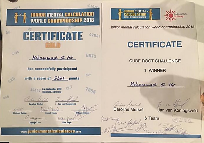 الفيديو الآتي نشر العام الماضي خلال مشاركة محمد المير بمسابقة للحسابات الذهنية في ألمانيا متغلباً على أربعة أساتذة مشهود لهم بالخبرة في هذا المجال: