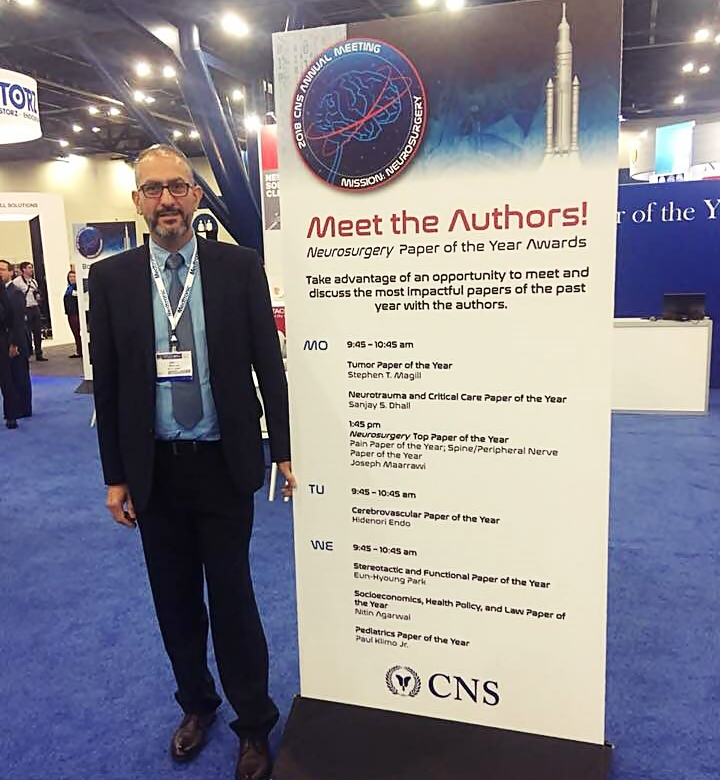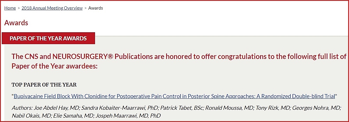 نال البروفيسور اللبناني جوزيف المعراوي، المتخصص في جراحة الدماغ والأعصاب والعمود الفقري والباحث في علوم الأعصاب، جائزة أفضل بحث علمي لهذا العام Top Paper of the Year، من قبل جمعية CNS - Congress of Neurological Surgeons التي تنهي اليوم الأربعاء أعمال مؤتمرها السنوي المنعقد في هيوستن، تكساس؛ وذلك عن دراسة قدمها بعنوان: "Bupivacaine Field Block With Clonidine for Postoperative Pain Control in Posterior Spine Approaches: A Randomized Double-blind Trial"