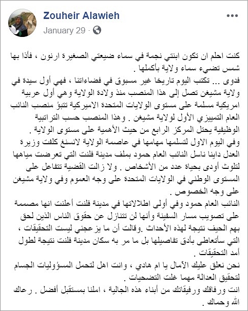 والدها، الكاتب والناشط في ولاية ميشيغن زهير علوية، كتب مؤخراً على الفايسبوك عن ابنته والمهمة التي أوكلت إليها معرباً عن فخره الشديد بها وبما حققته بوصولها إلى هذا المنصب الذي يحتل المركز الرابع من حيث الأهمية والتراتبية الوظيفية على مستوى الولاية .