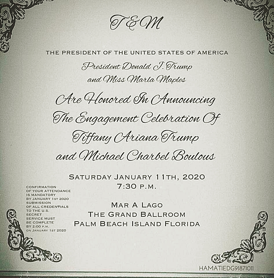 بعد أكثر من عام بقليل على تعارفهما، زُف الخبر السعيد من البيت الأبيض وبدأ توزيع الدعوات لحفل خطوبة الإبنة الصغرى للرئيس الأميركي دونالد ترامب، تيفاني، وحبيبها اللبناني - النيجيري مايكل بولس الذي يقام يوم السبت في 11 كانون الثاني الجاري في فلوريدا.