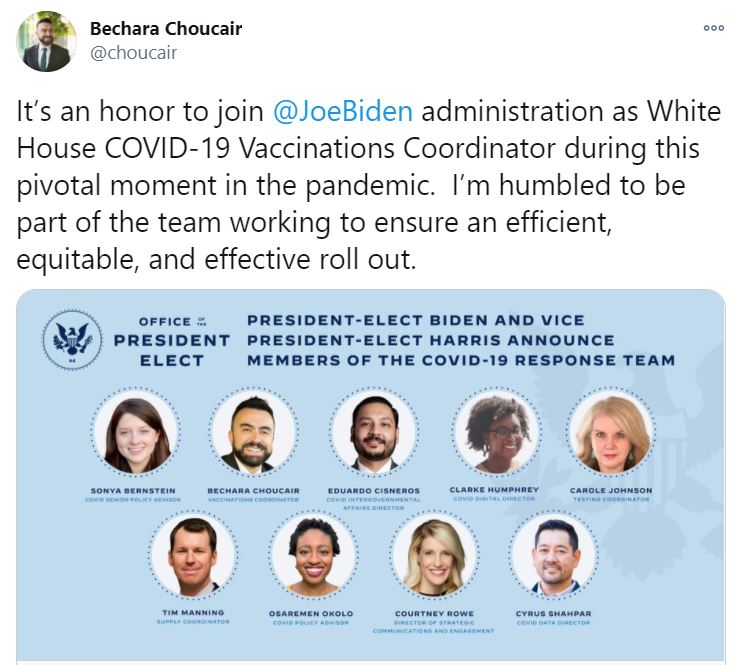 وإلى جانب شقير، عين بايدن كارول جونسون وتيم مانيينغ في فريق الاستجابة للوباء، لتنسيق اللقاح والفحص واستراتيجية سلاسل التوريد. ومن المقرر أن يلعب هؤلاء المسؤولون دورًا رئيسيًا في استجابة الإدارة الأميركة الجديدة للوباء.