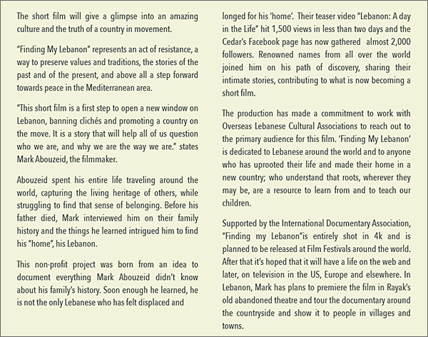 Finding My Lebanon للمخرج مارك أبو زيد يعرض الشهر المقبل في مهرجان كان السينمائي. وهو من إنتاج Cedars Productions، ولاحظ "جبلنا ماغازين" اهتماماً لافتاً بالفيلم من قبل الشبيبة المتحدرين من أصول لبنانية المنتشرين في العالم، وبشكل خاص أولئك الذين أتيح لهم يوماً زيارة لبنان والتعرف عليه عن قرب.