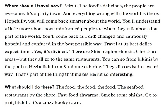 أما أسباب إعجابه ببيروت، فوضعها بوردين كالآتي: "الأكل طيب، والناس مميزون، إنها مدينة للحفلات وكل شيء خطأ في العالم تجده هناك". وأضاف: "تعود من بيروت وأنت أكثر ذكاء حول العالم، وبعد ذلك ستفهم بشكل أفضل كيف يتحدث بعض الأشخاص بشكل جاهل عن تلك المنطقة".