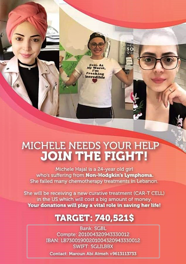 يمكن للراغبين في لبنان والعالم التبرع لعلاج ميشيل عبر تحويل المال إلى حساب مخصص لذلك في بنك SGBL في بيروت (التفاصيل موجودة في الصورة المرفقة في الأسفل) أو بالبطاقة الإئتمانية Credit Card عبر موقع Go Fund Me على الرابط التالي: