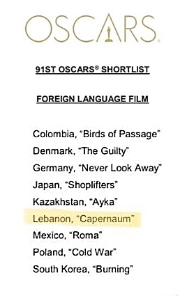 بعد فوزه بجائزة لجنة التحكيم فى مهرجان كان السينمائى الدولي وترشيحه ضمن القائمة القصيرة لجائزة غولدن غلوب، يتجه فيلم "كفرناحوم" Capernaum للمخرجة اللبنانية نادين لبكي بثقة نحو جائزة الأوسكار للعام المقبل، حيث وضعته أكاديمية فنون وعلوم الصور المتحركة في هوليوود على قائمة قصيرة تتضمن ثمانية أفلام أجنبية مرشحة للفوز بالأوسكار في الحفل النهائي الذي سيقام في 24 شباط المقبل.