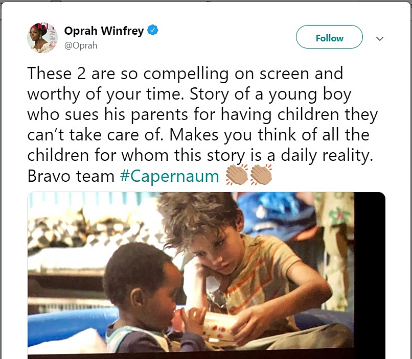 يذكر أنّ الإعلامية الأميركية الأشهر أوبرا وينفري غردت عن فيلم كفرناحوم قبل أيام و ونشرت صورة من أحد مشاهده.