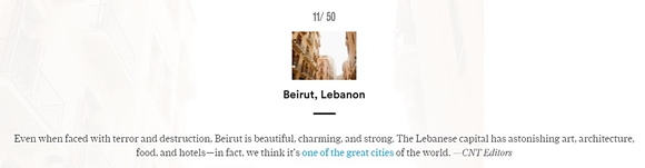 في تعريفهم عن بيروت، كتب معدّو التقرير: "حتى عندما تواجه الرعب والدمار، بيروت جميلة، ساحرة، وقوية. العاصمة اللبنانية فيها الفن والهندسة المعمارية والمأكولات والفنادق المثيرة للدهشة. وفي الواقع، نحن نعتقد انها واحدة من أهم المدن في العالم". (وأرفقوا ذلك بصورة لعدد من المباني التاريخية المحدّثة في وسط بيروت).