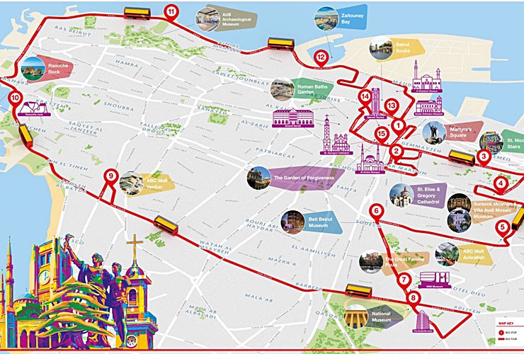 وبحسب بيان وزعته الشركة، "سيشاهد كل راكب على مدى 45 دقيقة معالم بيروت من خلال 15 محطة متنوعة يتوقف عندها الباص. ويمكن للسائح الصعود والنزول في أي محطة كما يشاء خلال مهلة 24 ساعة، مما يسمح للراكبين بإستكشاف أحياء وشوارع ومواقع أثرية ذات أهمية كبيرة للمدينة بأفضل رؤية وأكثرها متعة وإثارة".