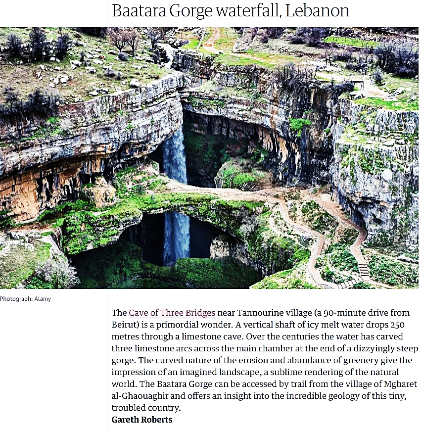 وكتبت "ذا غارديان": "تقع شلالات مغارة الجسور الثلاثة قرب بلدة تنورين الشمالية في قضاء البترون وتبعد عن بيروت نحو 90 دقيقة بالسيارة. تعرف أيضاً ببالوع بعتارة أو بالوع بلعا أو بالوع الجسور الثلاثة، الذي يصنف كأحد أقدم شلالات العالم، حيث تتساقط المياه الباردة من ارتفاع 250 متر من كهف كلسي. وعبر العصور، نحتت المياه ثلاثة جسور كلسية على امتداد الكهف الأساسي في نهاية انحدار شديد. ويعطي التآكل الطبيعي المتعرّج ووفرة الاخضرار الذي يغلّف المكان انطباعاً بأننا أمام مشهدية متخيلة، ورهبة العالم الطبيعي. يمكن الوصول إلى بالوع بعتارة عبر مسار من بلدة مغارة الغراغير. وتمنحك لمحة عن هذه الجيولوجيا المذهلة لهذا البلد الصغير والمضطرب".