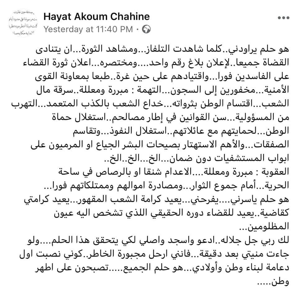 في كلمات تعكس حلماً يراود أي لبناني، مقيم أو مغترب، جلّ ما يريده هو إحقاق الحق وأن تعم دولة القانون في بلده ويلقى كل مرتكب وسارق وفاسد أوصل لبنان إلى الوضع المزري الذي يترنح فيه في هذه الأيام العقاب الذي يستحقه، دونت القاضية حياة عاكوم شاهين على الفايسبوك تمنيات قالت إنها حلم يراودها "كلما شاهدت التلفاز ومشاهد الثورة". وما لبث أن انتشر ما دونته بشكل واسع على مواقع التواصل الاجتماعي.