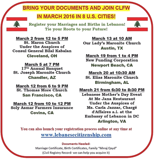 كا لفتت المؤسسة في بيانها إلى أن حملات التسجيل في خلال شهر آذار الجاري تشمل ثماني مدن أميركية، هي: كليفلاند (أوهايو) – برعاية سعادة القنصل العام في ديترويت بلال قبلان ، تشاندلر (أريزونا)، سان فرنسيسكو وكوفينا ونيوبورت بيتش (كاليفورنيا)، أوستن (تكساس) وكذلك في أرلينغتون (فرجينيا) – برعاية سعادة القائم بالأعمال في السفارة اللبنانية في واشنطن كارلا جزار.