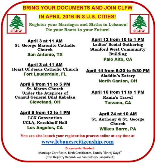 وذكّرت المؤسسة بأن الوثائق المطلوبة هي: إخراج القيد اللبناني لرب العائلة، وثائق الولادة للزوجة (الأجنبية) والأولاد، ووثيقة الزواج. ولمزيد من التوضيحات، بالإمكان الاطلاع على موقع المؤسسة الإلكتروني: www.lebanesecitizenship.com