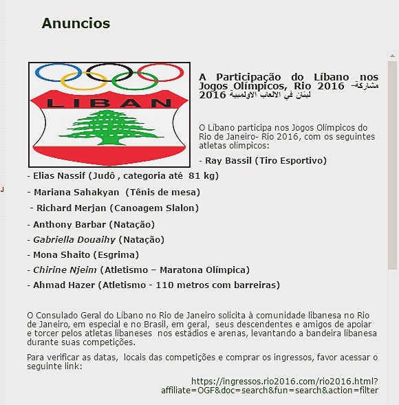 مع اقتراب موعد انطلاق الالعاب الأولمبية 2016 في ريو دو جانيرو، البرازيل بين 5 و21 آب المقبل، دعت قنصلية لبنان العامة في الريو أبناء الجالية والمتحدرين من أصول لبنانية وأصدقاء لبنان من البرازيليين إلى مؤازرة وتشجيع اللاعبين المشاركين في هذه الألعاب وحضور مبارياتهم ورفع العلام اللبناني في الملاعب.
