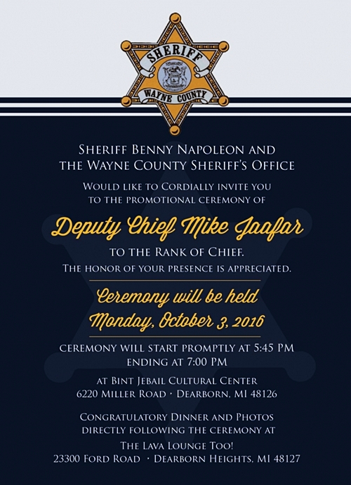 وجهت شرطة مقاطعة "واين" في ولاية ميشيغن الأميركية دعوة عامة حملت توقيع "الشريف" بيني نابليون إلى حضور حفل خاص يقام مساء اللإثنين المقبل في مقر نادي بنت جبيل الثقافي الاجتماعي في ديربورن بمناسبة ترقية اللبناني الأصل مايك جعفر إلى منصب رئيس شرطة مقاطعة "واين".