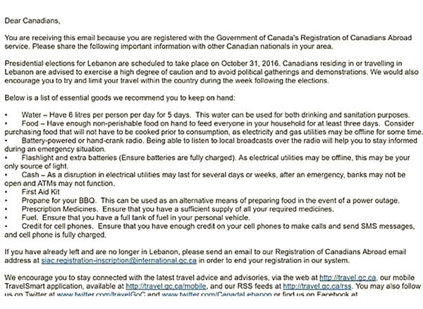 وجاء في نص الرسالة "لقد تحدد موعد الانتخابات الرئاسية في لبنان يوم الاثنين 31 تشرين الأول الجاري، ولهذا السبب فإن الرعايا الكنديين المقيمين في لبنان أو الذين هم في صدد السفر اليه مدعوون الى اتخاذ أقصى درجات الحذر".