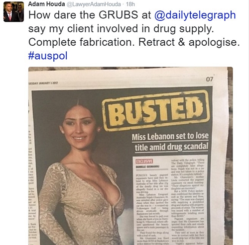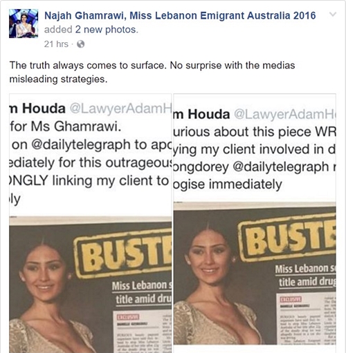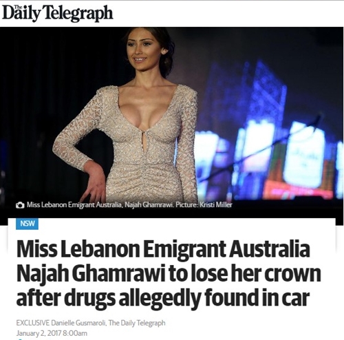 فالخبر الذي نشرته الصحيفة الأسترالية جاء تحت عنوان " Miss Lebanon Emigrant Australia Najah Ghamrawi to lose her crown after drugs allegedly found in car”