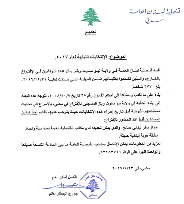 وتوجهت القنصلية إلى أبناء الجالية في ولاية نيو ساوث ويلز المسجلين للاقتراع في سيدني، بالإسراع في تحديث مستنداتهم قبل تاريخ إجراء هذه الإنتخابات، مشيرا إلى أنه يتوجب عليهم عند الحضور للإقتراع تقديم أحد هذين المستندين فقط: إما جواز سفر لبناني صالح، أو بطاقة هوية لبنانية حديثة.