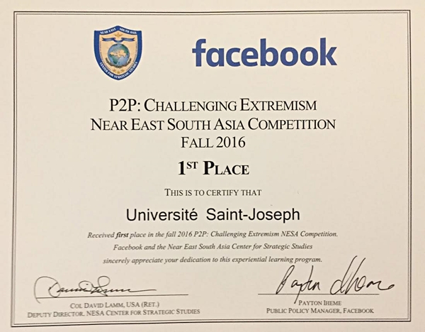 فاز فريق مؤلف من أحد عشر طالباً لبنانياً من الجامعة اليسوعية بالجائزة الأولى عن منطقتيْ الشرق الأدنى وجنوبي آسيا في مسابقة عالمية أعلنت نتائجها أمس في واشنطن بعنوان P2P Challenging Extremism أجراها الفايسبوك بالتعاون مع وزارة الخارجية الأميركية.