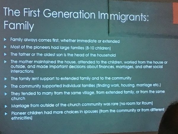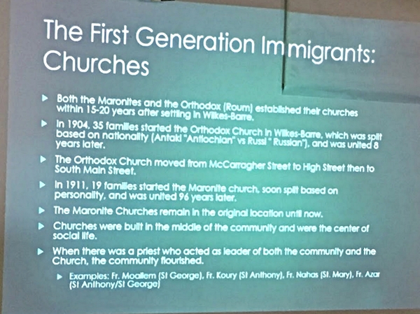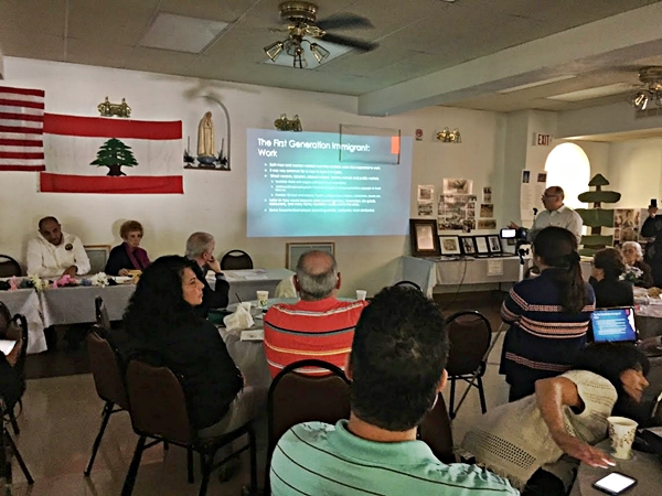 ثم تحدث الدكتور ريمون خضري عن تاريخ الجالية بدءاً من وصول أول الوافدين وتاريخ إنشاء الكنيسة، وظروف معيشة أولى العائلات التي استقرت في المدينة وتغيير (أمْرَكة) أسماء هذه العائلات بعد وصولها إلى الولايات المتحدة.