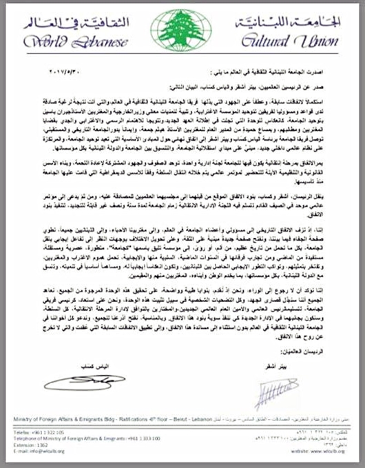 "استكمالا لاتفاقات سابقة، وعطفاً على الجهود التي بذلها فريقا الجامعة اللبنانية الثقافية في العالم، والتي أتت نتيجة لرغبة صادقة لدى قواعد ومسؤولي الفريقين لتوحيد المؤسسة الاغترابية، وتلبية لتمنيات معالي وزيرالخارجية والمغتربين الأستاذ جبران باسيل بتوحيدالجامعة، كانعكاس للوحدة التي تجلت في إطلالة العهد الجديد، وتتويجاً للاهتمام الرسمي والاغترابي والجدي بقضايا المغتربين ومطالبهم، وبمساعٍ حميدة من المدير العام للمغتربين الأستاذ هيثم جمعة، وإيمانا بدور الجامعة التاريخي والمستقبلي، توصل فريقا الجامعة برئاسة الياس كساب وبيتر أشقر إلى اتفاق نهائي حول المبادئ الأساسية التي تعيد توحيد الجامعة، والمرتكزة على نظام عالمي داخلي جديد، مبني على مبدأي استقلالية الجامعة، والتنسيق بين الجامعة والدولة اللبنانية بكل مؤسساتها.