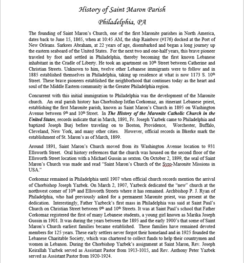 تأسست كنيسة مار مارون في فيلادلفيا قبل 125 سنة على يد الراهب الماروني اسطفان قرقماز. أما أول لبناني وصل إلى فيلادلفيا فهو سركيس أبراهام الذي أتاها قبل ذلك بحوالي خمس سنوات سيراً على الأقدام من نيو أورلينز حيث حطت السفينة "راينبو" التي أبحرت به إلى العالم الجديد، واستغرقت مسيرته سنتين ونصف السنة قطع فيها الولايات المتحدة من جنوبها إلى شمالها.