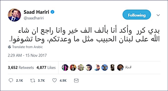 بعد ساعات على إنهاء البطريرك الماروني مار بشارة بطرس الراعي زيارةً وصفت بالتاريخية للمملكة العربية السعودية وولقائه بالملك السعودي سلمان بن عبد العزيز وولي عهده الأمير محمد بن سلمان وكبار مسؤولي المملكة واجتماعه فيها إلى الرئيس سعد الحريري الذي كان قد أعلن استقالة حكومته قبل أيام من الرياض، أطلق رئيس الجمهورية العماد ميشال عون اليوم مواقف تصعيدية بحق المملكة متهماً إياها علناً باحتجاز الحريري وأنها بذلك تمارس عملاً عدائياً تجاه لبنان. فيما لاقى الرئيس الحريري تصريحات عون بتأكيده مجدداً في تغريدة على تويتر بأنه بخير وسيعود إلى لبنان قريباً.