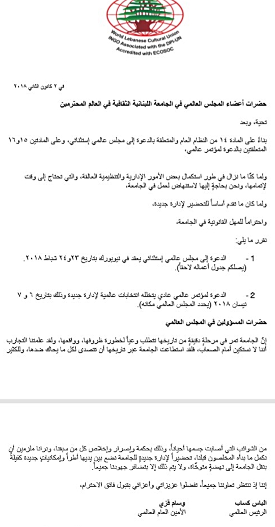 وجاء في نص الدعوة التي وجهها الرئيس العالمي الياس كساب والأمين العام وسام القزي إلى أعضاء المجلس العالمي في الجامعة: