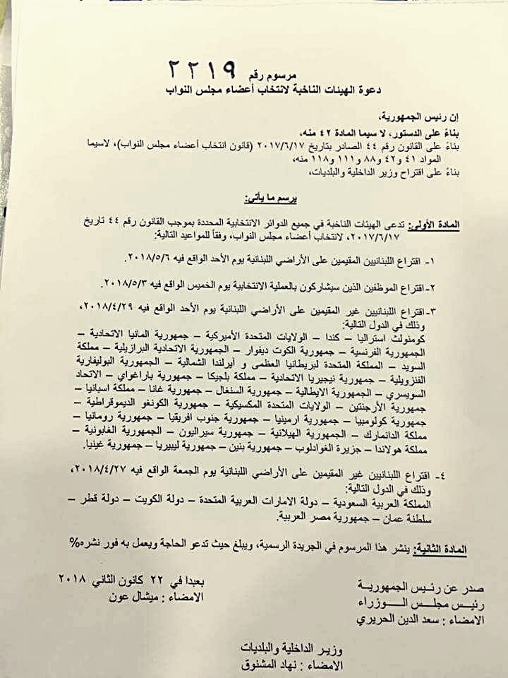 وقع رئيس الجمهورية العماد ميشال عون بعد ظهر اليوم، مرسوم دعوة الهيئات الناخبة لانتخاب أعضاء مجلس النواب، وحمل المرسوم الرقم 2219 تاريخ 22 كانون الثاني 2018.