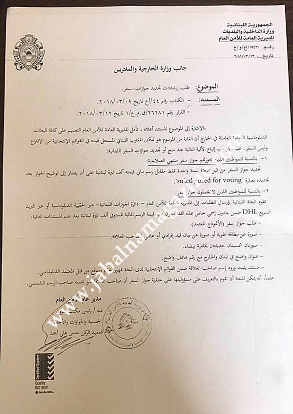 تلقى موقع "جبلنا ماغازين" من أحد الناشطين في شؤون الاغتراب في الولايات المتحدة صورة لمستند رسمي موجه من المديرية العامة للأمن العام يتعلق بما كان أعلنه قبل أيام وزير الخارجية جبران باسيل من أنه سيتاح للمغتربين الحصول على جواز سفر جديد أو تجديد جوازاتهم المنتهية الصلاحية بسرعة قياسية ولقاء مبلغ رمزي (ألف ليرة) من أجل تمكينهم من التصويت في الانتخابات النيابية المقبلة.