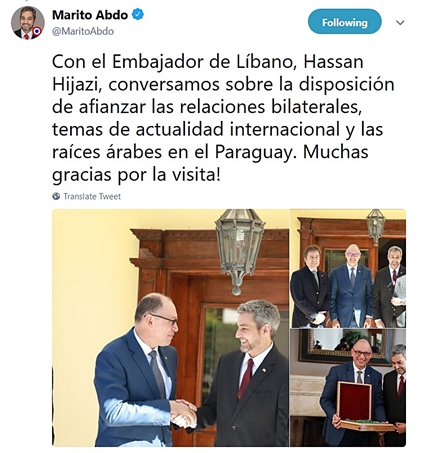 لأول مرة منذ انتخابه رئيساً للبارغواي الشهر الماضي، قام السفير اللبناني في أسانسيون حسن حجازي بزيارة تهنئة للرئيس المنتخب، اللبناني الأصل، ماريو عبدو.