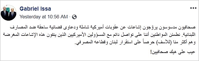 ويأتي كلام السفير اللبناني بعد انتشار أخبار في الايام الماضية زعمت ان إدارة الرئيس الأميركي دونالد ترامب هددت بإلغاء التعامل مع مصارف لبنانية. وكان عيسى علّق على هذه الأخبار عبر "فايسبوك" قائلاً إنها "شائعات" صادرة عن "صحافيين مدسوسين".
