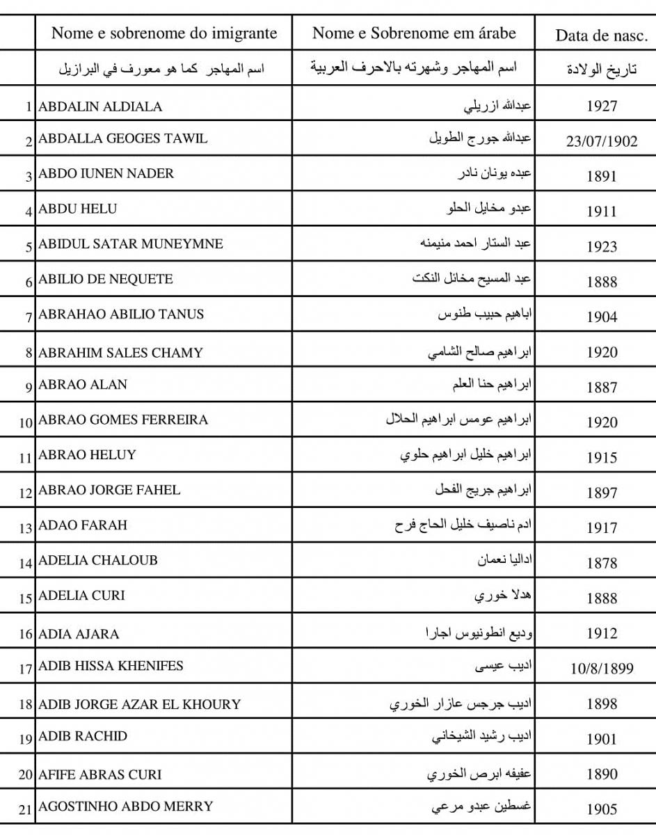 ولفتت القنصلية إلى أن عدداً كبيراً من المهاجرين غيروا أو ترجموا أسماءهم في المهجر. لذلك تم تدوين الأسماء على اللائحة باللغتين العربية والبرتغالية تسهيلاً للتواصل مع عائلاتهم المنتشرة في كل انحاء البرازيل.