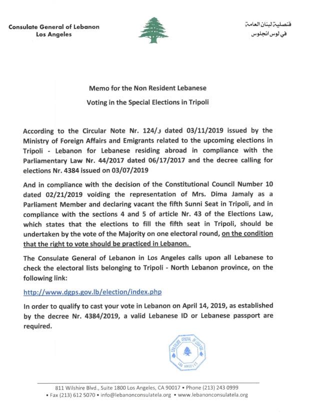 وجهت السفارات والقنصليات اللبنانية في الخارج رسائل إلكترونية إلى الرعايا اللبنانيين غير المقيمين على الاراضي اللبنانية حول كيفية مشاركتهم في الاقتراع في الانتخابات الفرعية للدائرة الصغرى في طرابلس، والمحددة يوم 14 نيسان المقبل.