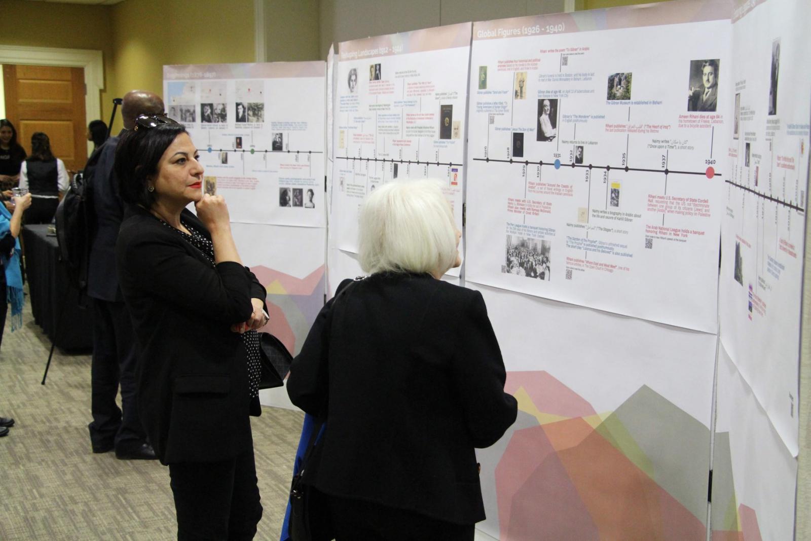 In addition to the symposium, the Gibran Chair staff organized, for the first time, an exhibit about these three Arab-American thinkers who have contributed to both the Arab literary renewal as well as to America’s cultural fabric. It included a timeline depicting the lives of all three of them and the intersections of their lives; a collection of their major works in English and Arabic, including first edition copies of their books, as well as books about them; the circle of friends and influencers of Gibran, Rihani, and Naimy, and their common friends and influencers; the influential women in the lives of Gibran and Rihani; their impact around the world, depicted by a list of 75 professors at different universities in the world who teach about Gibran, Rihani, and Naimy, or who conduct research about them and lecture about them; copies of handwritten letters by the three of them in English and in Arabic; different portraits of the three of them; Arabic calligraphy by artist Fuad Stephan of a number of pages from “The Prophet”; floating quotations by all three of them; and an introduction to the Pen League.