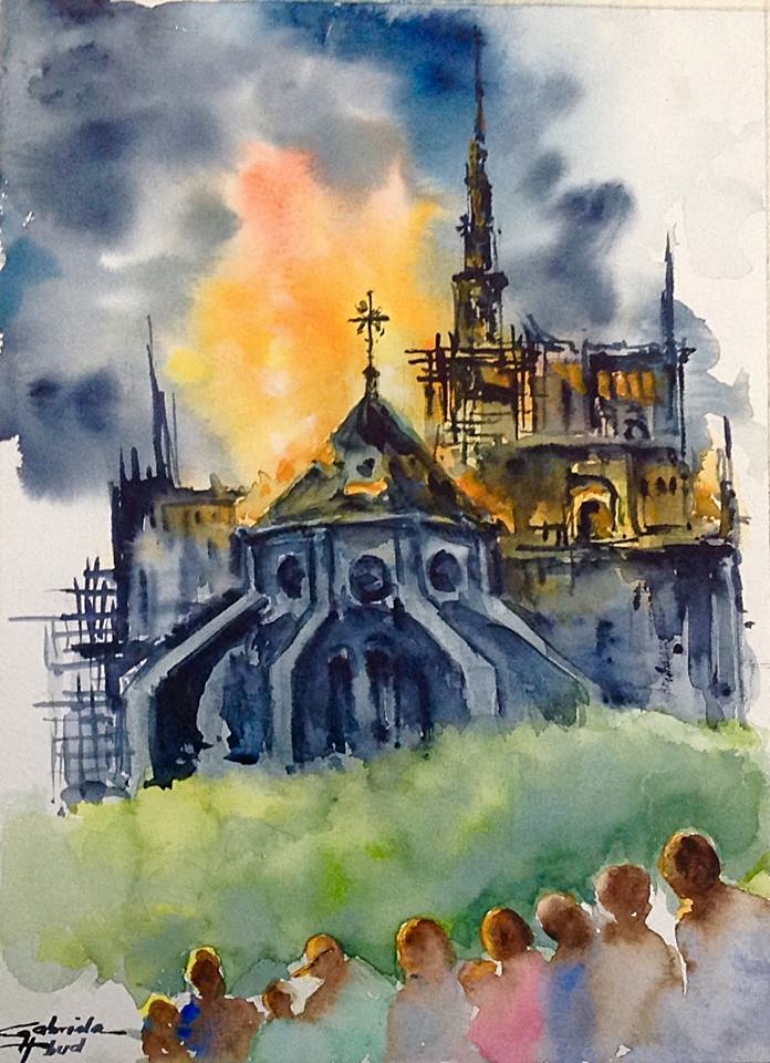 الرسامة المكسيكية اللبنانية غبرييلا عبود تعكس حزنها العميق لمشهد احتراق كاتدرائية نوتردام بلوحة رائعة