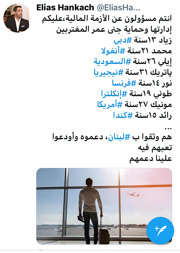 وإذ أرفق في تغريدته أسماء بعض المغتربين وعدد سنين اغترابهم، أشار إلى أن المغتربين وثقوا بلبنان فدعموه وأودعوا تعبهم فيه، قائلاً: "علينا دعمهم".