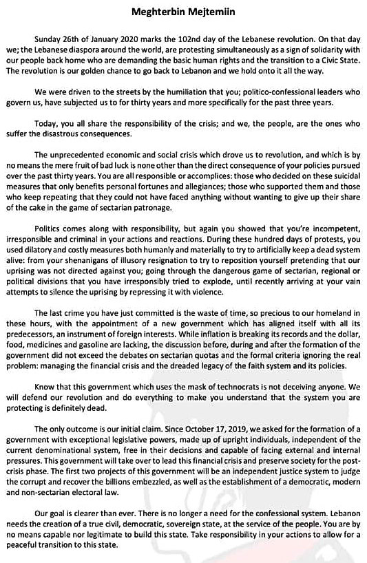 وبالتزامن مع إقامة هذه التجمعات وزعت مجموعة "مغتربين مجتمعين" التي نسقت بين منظمي هذه التحركات بياناً باللغات العربية والفرنسية والإنكليزية اعتبرت فيه أن تشكيل حكومة جديدة في لبنان مشابهة لسابقاتها هو جرم إضافي تمارسه السلطة السياسية وإضاعة مكلفة للوقت.