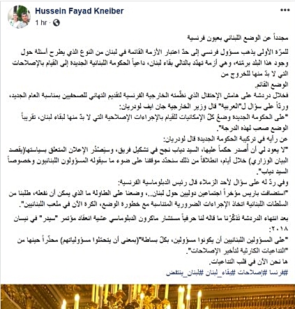 وكتب الزميل الصحافي حسين فياض قنيبر، وهو مسؤول مكتب "العربية" في باريس على حسابه على الفايسبوك أنها "للمرّة الأولى يذهب مسؤول فرنسي إلى حدّ اعتبار الأزمة القائمة في لبنان من النوع الذي يطرح أسئلة حول وجود هذا البلد برمّته، وهي أزمة تهدّد بالتالي بقاء لبنان، داعياً الحكومة اللبنانية الجديدة إلى القيام بالإصلاحات التي لا بدّ منها للخروج من الوضع القائم.