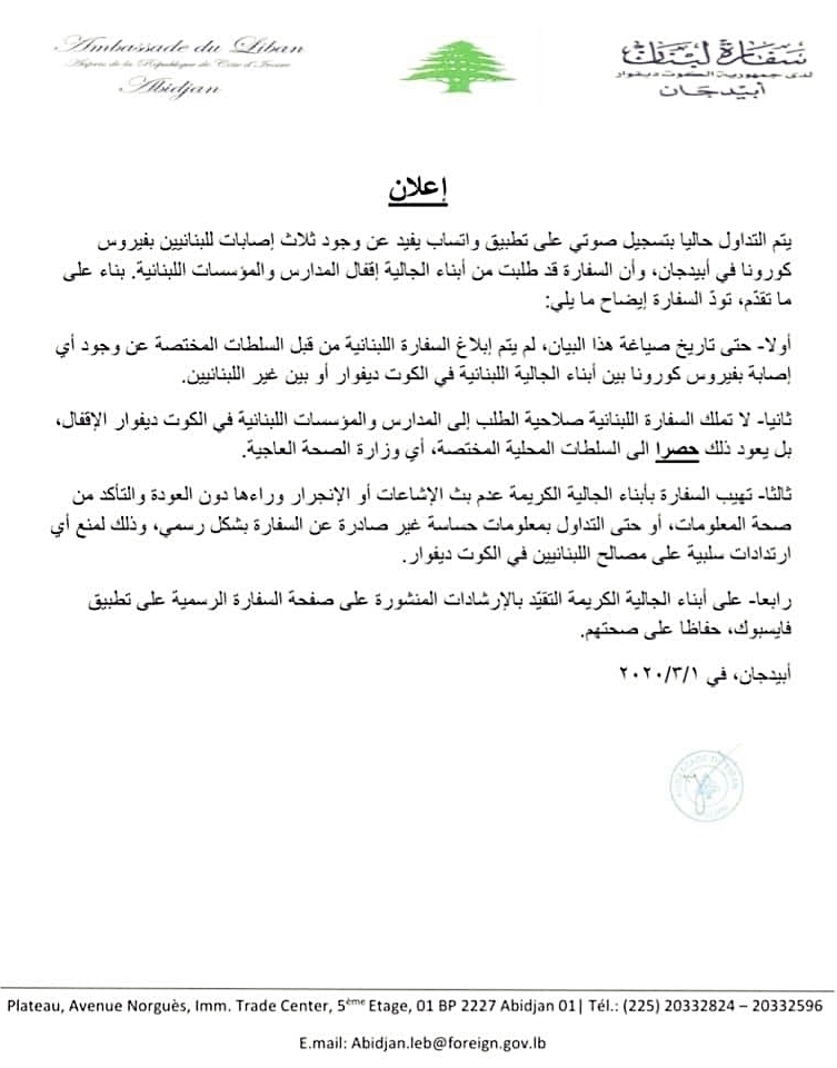 نفت السفارة اللبنانية في بيان لها صحة الشائعات التي جرى تناقلها عبر الواتساب عن وجود إصابات بفيروس الكورونا بين اللبنانيين في الكوت ديفوار.