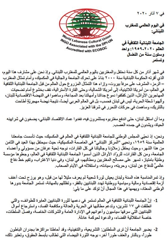 بمناسبة اليوم العالمي للمغترب اللبناني، أصدرت الجامعة اللبنانية الثقافية في العالم برئاسة ستيفن ستانتن بياناً استهلته بالقول إننا بهذه المناسبة "نقف بخشوع أمام تضحيات المهاجرين الأوائل ونتوجه بتحية عرفانٍ للروّاد الأوائل الذين أسسوا الجامعة اللبنانية الثقافية في العالم".