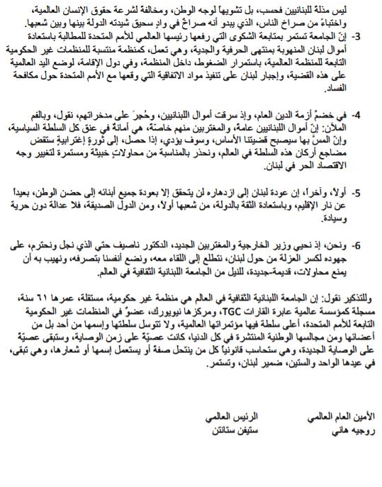 وأضاف البيان "إنّ الجامعة تستمر بمتابعة الشكوى التي رفعها رئيسها العالمي للأمم المتحدة للمطالبة باستعادة أموال لبنان المنهوبة بمنتهى الحرفية والجدية، وهي تعمل، كمنظمة منتسبة للمنظمات غير الحكومية التابعة للمنظمة العالمية، باستمرار الضغوط، داخل المنظمة، وفي دول الإقامة، لوضع اليد العالمية على هذه القضية، وإجبار لبنان على تنفيذ مواد الاتفاقية التي وقعها مع الأمم المتحدة حول مكافحة الفساد".