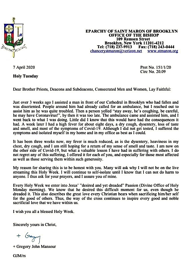 وأخبر المطران منصور في رسالته أنه منذ ثلاثة أسابيع تقدم لمساعدة شخص هوى على الطريق بالقرب من الكنيسة، فحذره بعض الذين كانوا بالقرب منه من أن يكون الرجل مصاباً بالفيروس فينقل العدوى إليه، إنما كان ذلك بعد فوات الأوان.